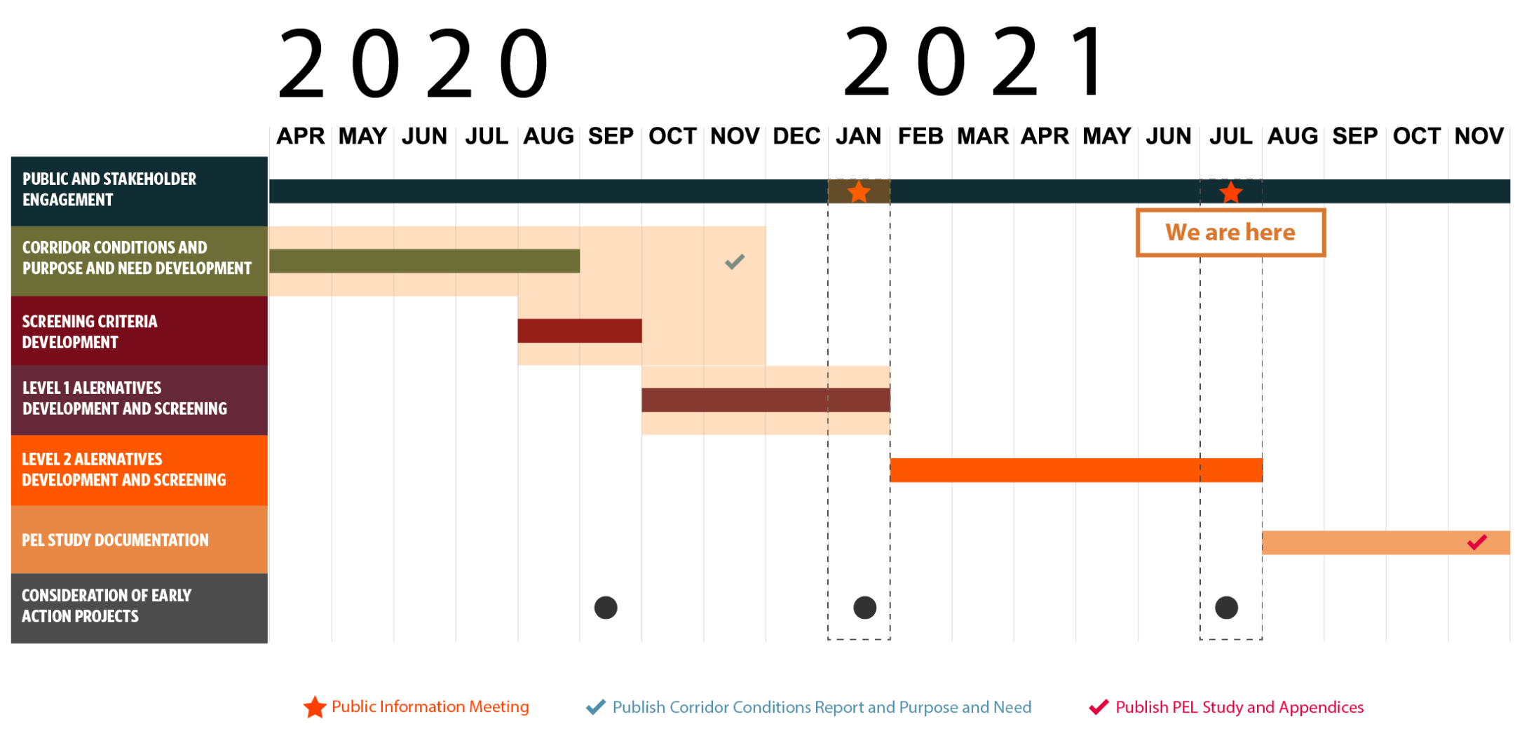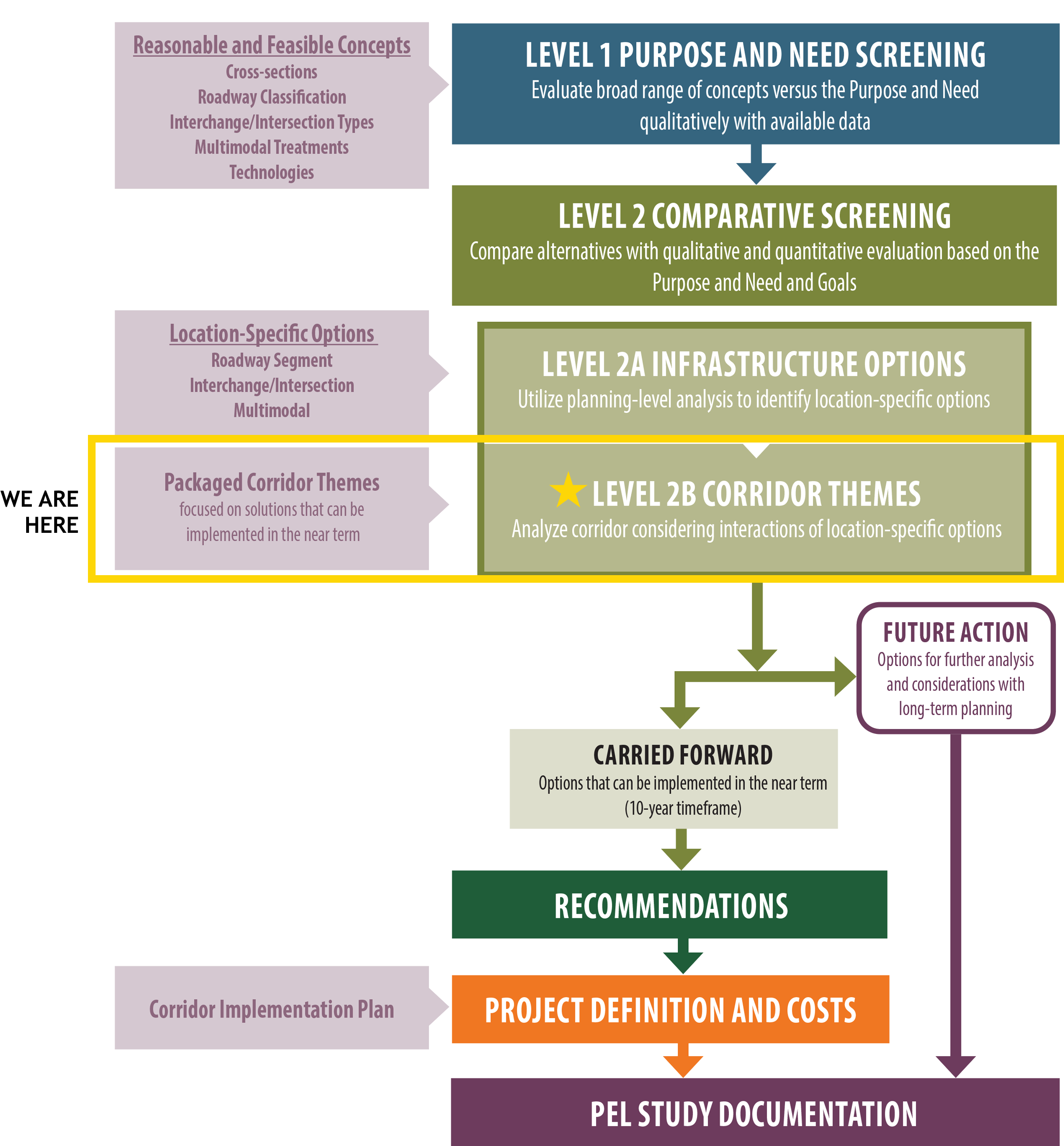 Our evaluation process is outlined in the graphic below. We are currently in the Level 2B Corridor Themes phase of the process.